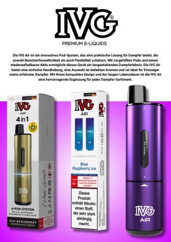 Die IVG Air ist ein innovatives Pod-System, das eine praktische L%u00f6sung f%u00fcr Dampfer bietet, diesowohl Benutzerfreundlichkeit als auch Flexibilit%u00e4t sch%u00e4tzen. Mit vorgef%u00fcllten Pods und einemwiederaufladbaren Akku erm%u00f6glicht dieses Ger%u00e4t ein langanhaltendes Dampferlebnis. Die IVG Airbietet eine einfache Handhabung, eine Auswahl an beliebten Aromen und ist ideal f%u00fcr Einsteigersowie erfahrene Dampfer. Mit ihrem kompakten Design und der langen Lebensdauer ist die IVG Aireine hervorragende Erg%u00e4nzung f%u00fcr jedes Dampfer-Sortiment.