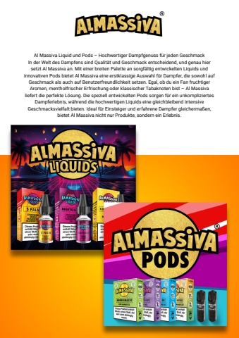 Al Massiva Liquid und Pods %u2013 Hochwertiger Dampfgenuss f%u00fcr jeden GeschmackIn der Welt des Dampfens sind Qualit%u00e4t und Geschmack entscheidend, und genau hiersetzt Al Massiva an. Mit einer breiten Palette an sorgf%u00e4ltig entwickelten Liquids undinnovativen Pods bietet Al Massiva eine erstklassige Auswahl f%u00fcr Dampfer, die sowohl aufGeschmack als auch auf Benutzerfreundlichkeit setzen. Egal, ob du ein Fan fruchtigerAromen, mentholfrischer Erfrischung oder klassischer Tabaknoten bist %u2013 Al Massivaliefert die perfekte L%u00f6sung. Die speziell entwickelten Pods sorgen f%u00fcr ein unkompliziertesDampferlebnis, w%u00e4hrend die hochwertigen Liquids eine gleichbleibend intensiveGeschmacksvielfalt bieten. Ideal f%u00fcr Einsteiger und erfahrene Dampfer gleicherma%u00dfen,bietet Al Massiva nicht nur Produkte, sondern ein Erlebnis.