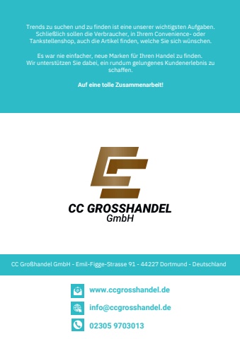 Emil-Figge-Strasse91-44227DTrendszusuchenundzufindenisteineunsererwichtigstenAufgaben.Schlie%u00dflichsollendieVerbraucher,inIhremConvenience-oderTankstellenshop,auchdieArtikelfinden,welcheSiesichw%u00fcnschen.Eswarnieeinfacher,neueMarkenf%u00fcrIhrenHandelzufinden.Wirunterst%u00fctzenSiedabei,einrundumgelungenesKundenerlebniszuschaffen.Auf eine tolle Zusammenarbeit!www.ccgrosshandel.deinfo@ccgrosshandel.de023059703013